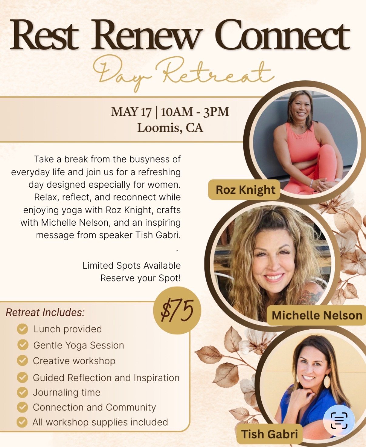 Join us for a restorative women’s retreat designed to help you slow down, reconnect, and focus on your well-being. The day will include gentle yoga with Roz, light massage sessions, a hands-on craft workshop led by Michelle Nelson, and an inspiring message from speaker Tish Gabri. Enjoy nourishing food, time to reflect, and meaningful connection with other women in a peaceful and supportive space.